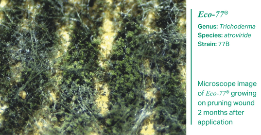 Trichoderma atroviride strain 77B is the active ingredient in our foliar applied, Eco-77® product. This strain of Trichoderma was isolated from the aerial environment and is well adapted to the challenges of this environment, such as UV and high temperatures. Eco-77® has been shown to survive on a pruning wound for up to 12 months. It is an aerial specialist that protects plants against the onslaught of other pathogens.